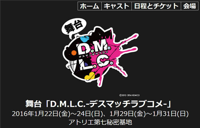 【速報】舞台「D.M.L.C.-デスマッチラブコメ-」チケット取扱開始のようです 2015.11.24 kemco-adv DMLC おしらせ 表題の通り、美笹木高校演劇部さんが主宰する舞台「D.M.L.C.-デスマッチラブコメ-」が、前売り券販売を開始なさったようですので、お伝えします! & […] 続きを読む 続きを読む